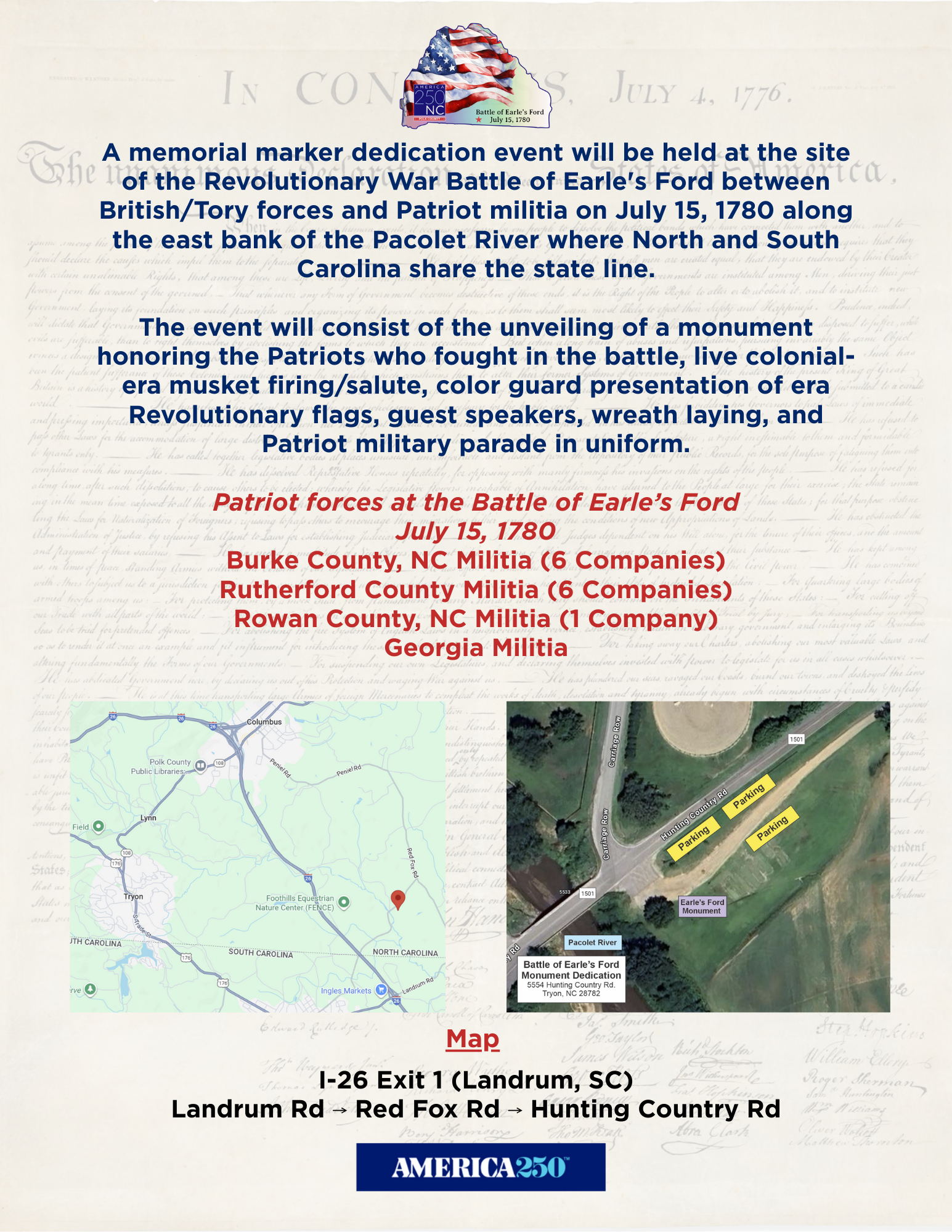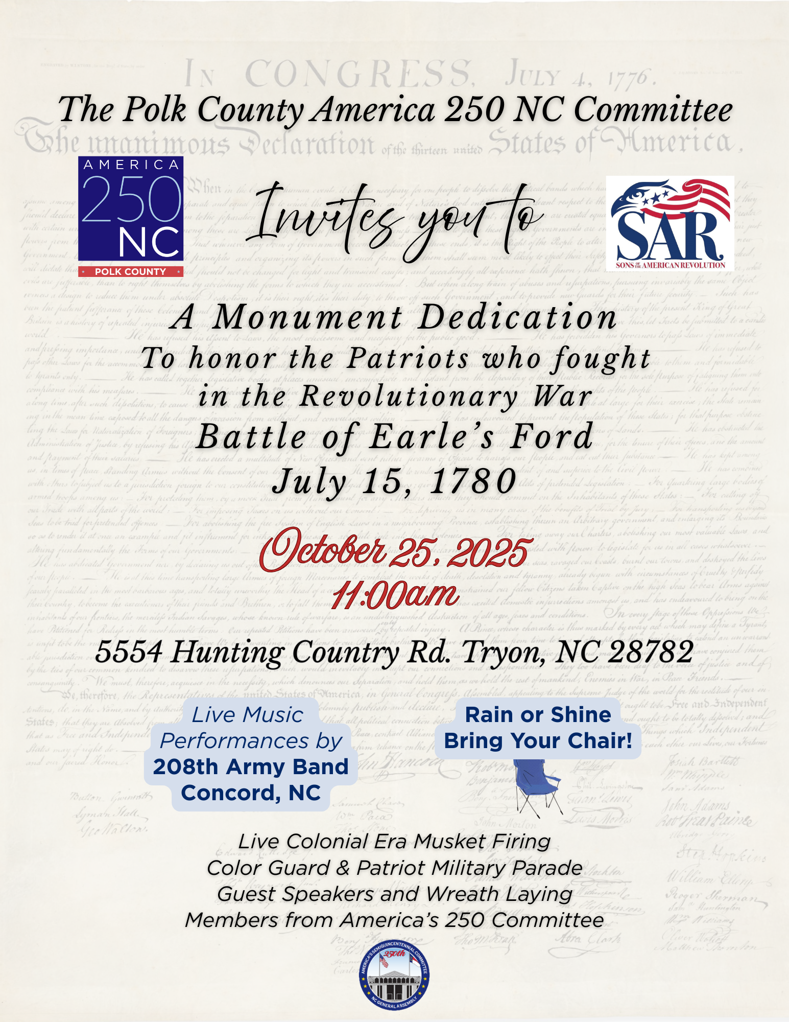 Dedication of a Memorial Monument to Patriots who fought in the Revolutionary War Battle of Earle’s Ford | Saturday, October 25, 2025 11:00am to 12:00pm EDT | 5554 Hunting Country Road, Tryon, NC, 28782 |